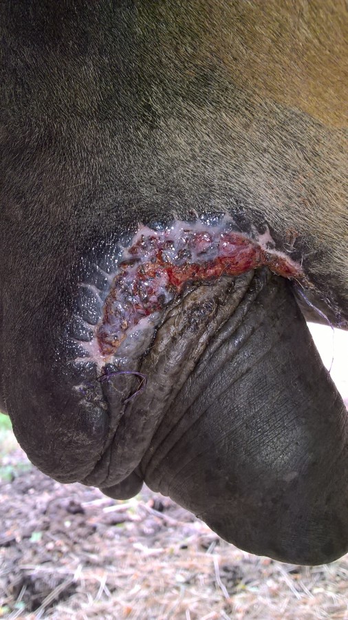 Après une semaine de box, les plaies du fourreau et de la cuisse se sont infectées et mon cheval a déclenché une lymphangite, malgré le fait que la gérante de la pension disait que ce n'était rien et que ça allait passé, j'ai appelé la véto pour avoir un vrai avis voyant que le postérieur droit de mon cheval avait doublé de volume et qu'il ne pouvait plus marcher...