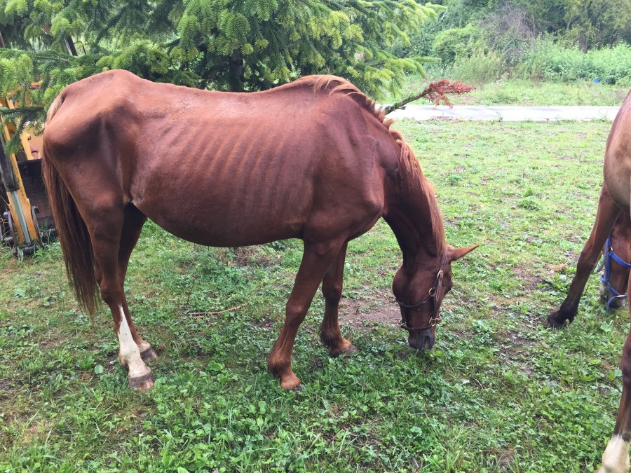 Ce n'est pas une ponette mince, ni maigre qui est arrivée. Mais bien cadavérique, cachectique, un sac d'os : ça résume bien son état... Je me suis effondrée lorsque la porte s'est ouverte, j'ai cru à une mauvaise blague.