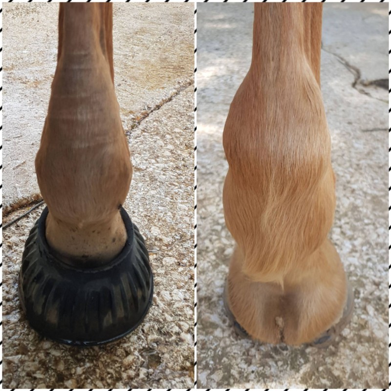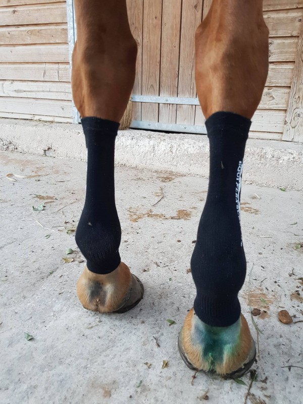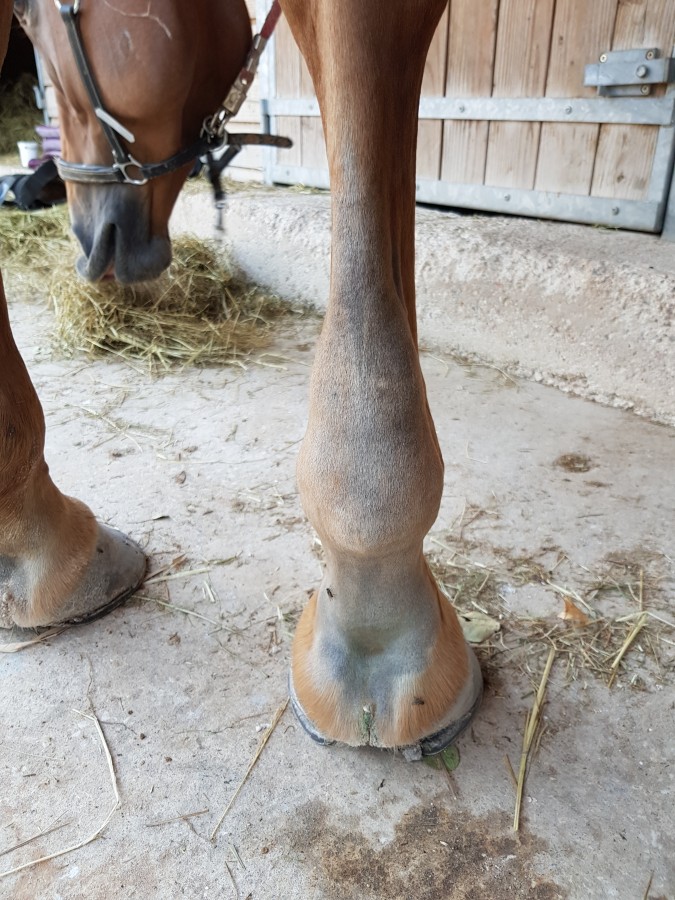 :fers à l‘envers, bien reculés à l’aplomb des talons, très roulants vers l’avant du pied. Eventuellement, pour renforcer l’efficacité et éviter l’écrasement des talons, ajouter une plaque et du silicone mi-ferme dans les lacunes.Idéalement, mettre des cloches épaisses et confortables en permanence pour éviter que la jument ne s’arrache les fers.