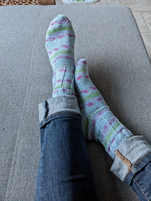 J'y ai mis très peu de motivation, mais j'ai fini les chaussettes bleues (le motif était désagréable à tricoter, et j'ai pas aimé travailler cette laine, par contre elles sont super à porter).