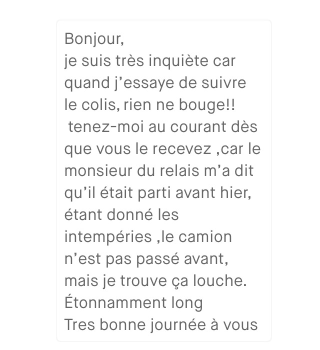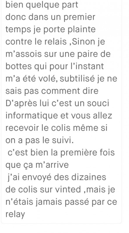 Je cherche une paire d'après ski pour un week end à La montagne. J'en trouve une paire timberland à un prix raisonnable. Je négocie un peu (oui désolée, je fais partie des vinties qui négocient presque systématiquement, je considère shérif ça fait partie du jeu de l'occasion, et en tant que vendeuse ça ne me dérange pas tant que ça reste raisonnable) et c'est accepté. Je valide l achat. Et là les embrouilles commencent. La vendeuse fait traîner l'envoi, prétextant sans cesse de nouveaux imprévus. Finalement elle traîne tellement que Vinted annule la vente. Je la contacte pour voir comment on peut faire, elle remet les Boots en vente et je les achète à nouveau. Quelques jours plus tard elle me dit avoir envoyé le colis mais rien n'apparaît sur le site. Le lendemain elle commence à me dire que le gars du colis n'a pas scanné son colis, voir même qu'il l'aurait volé. Elle me dit qu'elle est allé déposer plainte. L'histoire me paraît vraiment énorme, et la rapidité entre les différents rebondissements vraiment suspecte. Vinted m'a à nouveau remboursée mais elle a continué à me dire tantôt que j'allais quand même le recevoir, tantôt que le gars du relai était un voleur. Je vous laisse quelques un de ses messages pour me dire si vous pensez comme moi.