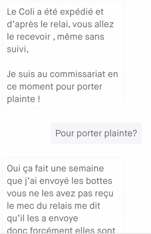 Maintenant elle joue les vierges effarouchées quand je lui demande des preuves de ce qu'elle avance, comme une copie de son dépôt de plainte ou le les coordonnées du point relais. Elle a même voulu me faire passer pour une malhonnête en disant que si ça se trouve j'avais reçu les Boots et que je ne l'avais pas dit.