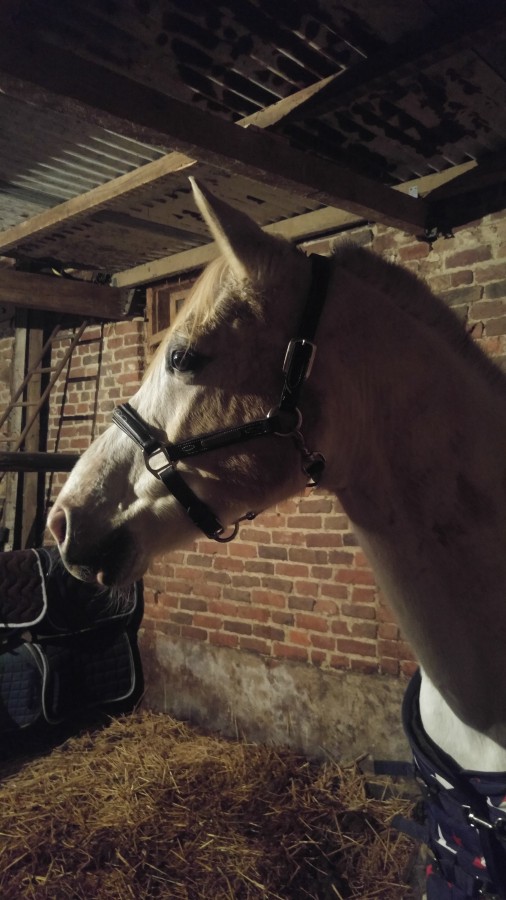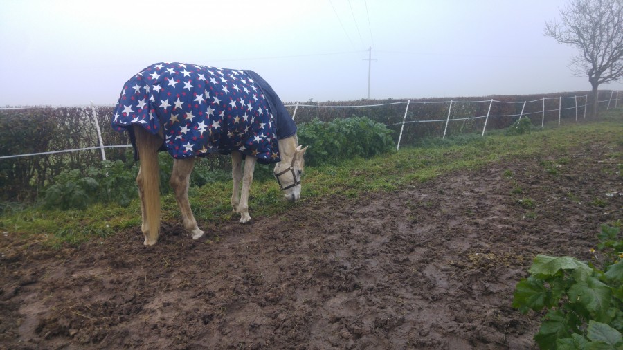Et vu le temps en ce moment, la couverture d'hiver et le couvre cou ont été sorti ! Bah il est bien content le gros. Surtout avant hier quand on a eu pluie, grêle et neige quasiment non stop et qu'il était dehors.