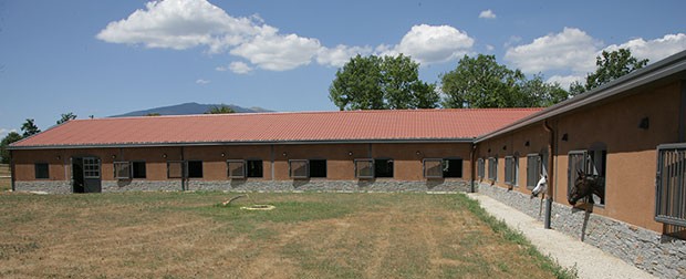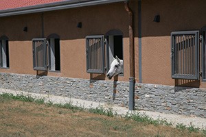 - copain mis pour lui tenir compagnie. Le copain dans un box mitoyen avec séparation de grille et avec accès à un paddock. Foin mis dans le box afin que le copain passe le plus de temps possible dans le box