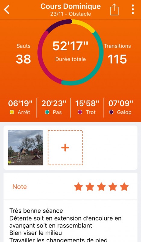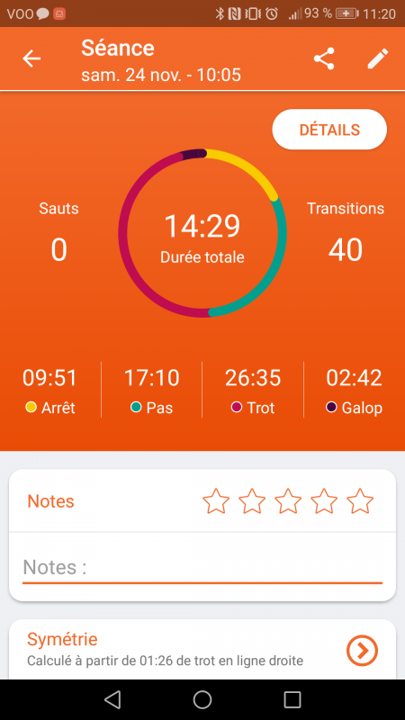 Il y a beaucoup de pas du fait que j'ai une jeune jument et pareil pour les arrêts, on fait souvent des pauses brout-brout. Je note 119 transitions (comme quoi cela va très très vite sans que l'on s'en rende compte).