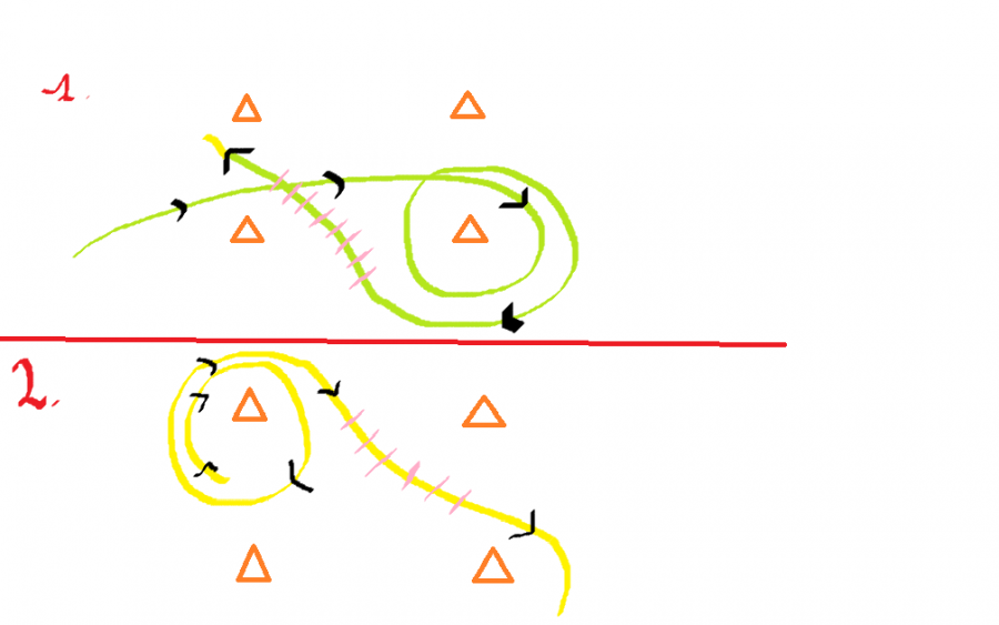 Donc voici le dispositif mis en place par la monitrice, à faire au trot, deux cercles, deux déplacements.