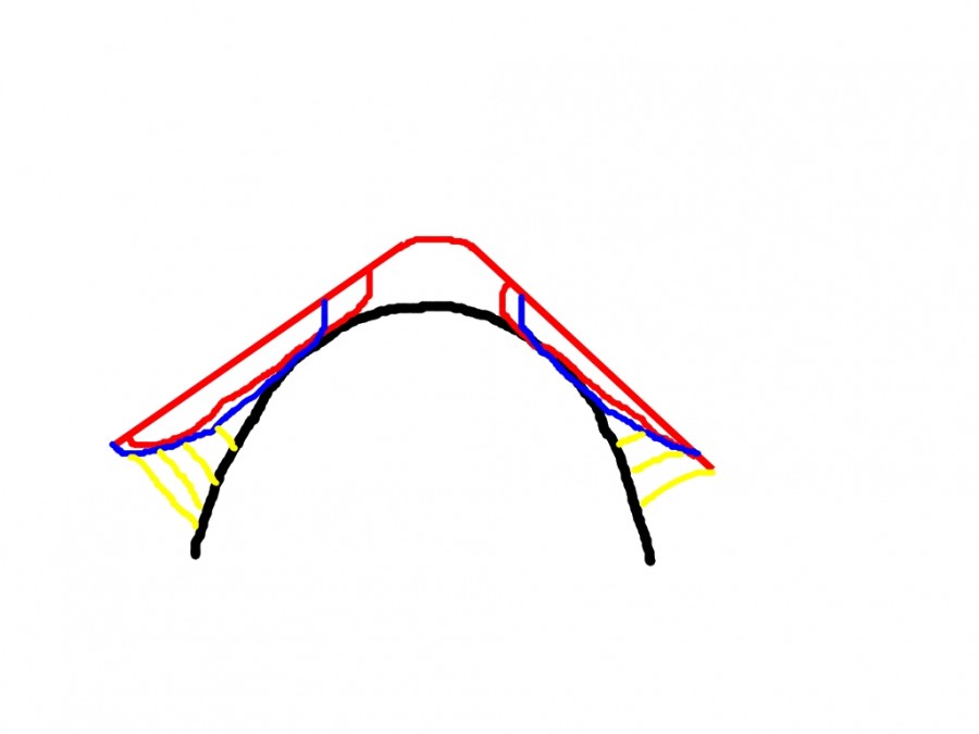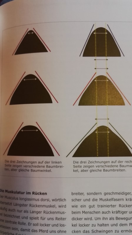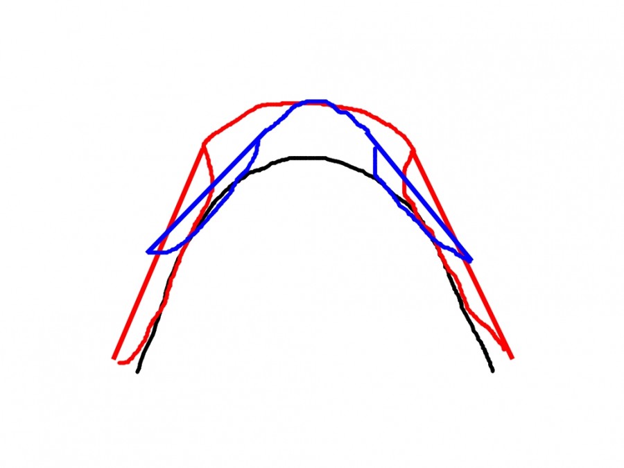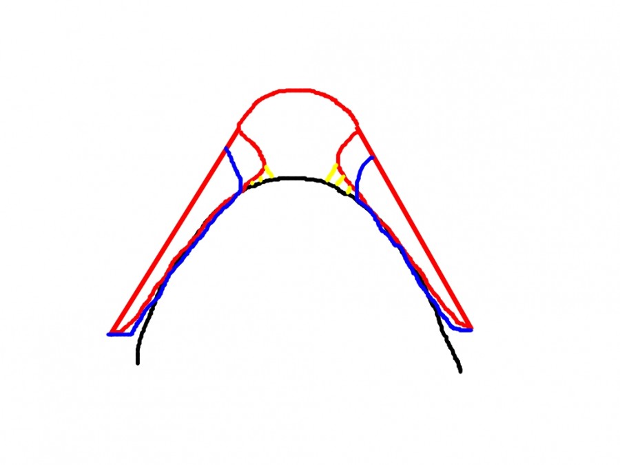 En bleu, l'arçon cob selon Thorrow'... Avec un mélange du premier schéma, mais les pattes d'arçon raccourcies pour laisser bouger correctement les épaules arrondies. Un siège aussi plus plat (de ce que j'ai pu observer, y a qu'à regarder le siège de la cob dressage de la marque pour s'en rendre compte) pour pallier à notre problème de pommeau à des km du dos...