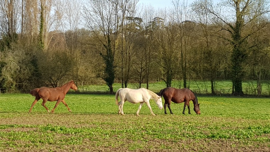 Pour les clôtures chacun fait comme il lui semble bon mais chez nous prairie sécurisée bah oui j'ai eu des petits malins qui passent en dessous des fils et vont faire un tour c'était principalement les bébés de Dakota donc tout est en fil électrique 3 + 3 bois pour la parcelle réservée aux bébés. Par contre je ne mets jamais l'électricité les premières fois un poulain à tendance à fuir et il voudra passer à tout prix au dela du fil. A la 2ème ou 3ème sortie je mets l'électricité. Ils ont déja couru, compris qu'il y a des arrêts et les Ho Ho de maman qui surveille ils comprennent vite.