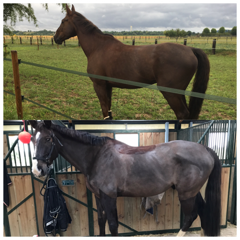 Pour le foin je le complémente par jour entre 10 et 15 kilo, le changement est radicale. Il ne mange plus sa paille, le box est propre et la prise de masse est flagrante. Je vous mets une petite photo avant/après, je vous laisse me dire ce que vous en pensez, mais je trouve le changement assez bluffant. Il lui manque encore un peu, mais S m’a dit que le muscle est long à se faire, alors patience.