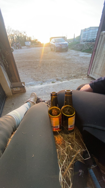 Et puis le soir tranquillement on s’est posé sur la botte de foin devant notre box avec une bonne bière. Le fameux rituel genial