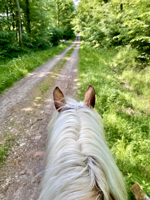 Une semaine après l'obtention de mon galop 1, je reçois un appel d'une jeune femme. Elle monte deux juments chez un propriétaire et elle a besoin d'une seconde cavalière pour partir en balade. On ne se connait bien entendu pas du tout, je ne connais pas ce propriétaire et encore moins les chevaux. Je n'ai jamais fait d'extérieur mais je saute sur l'occasion et j'y vais !!