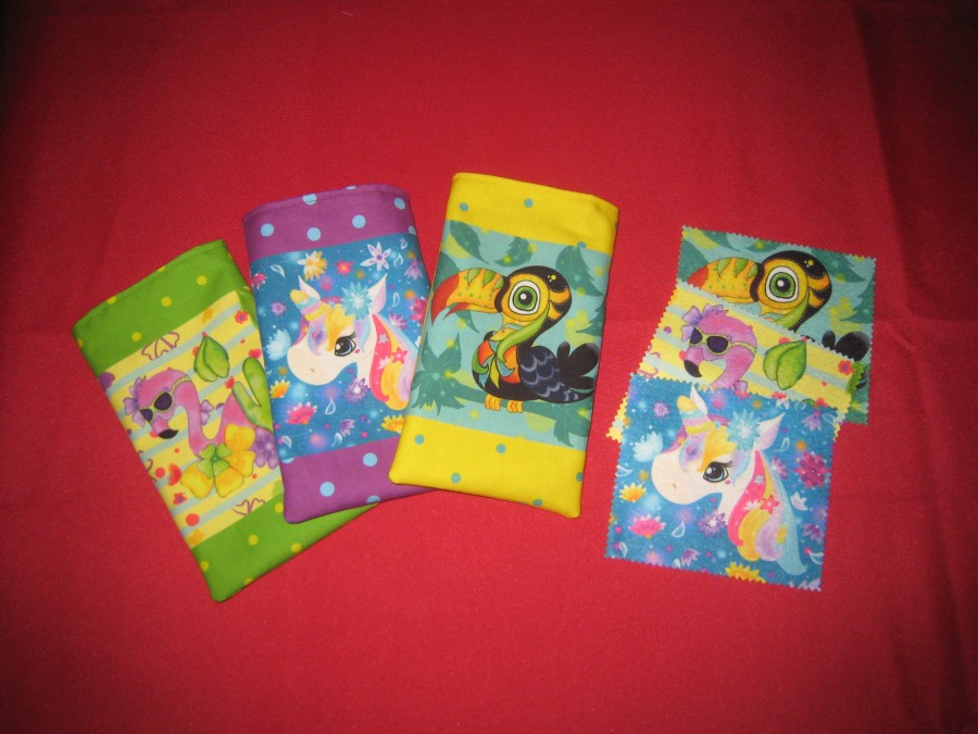 Allez je relance avec 3 petits étuis à lunettes. C'est une amie du cheval qui dessine et fait imprimer ses dessins sur tissu. Bon sur les 3, 2 sont pour offrir (il manque les pressions sur la photo)