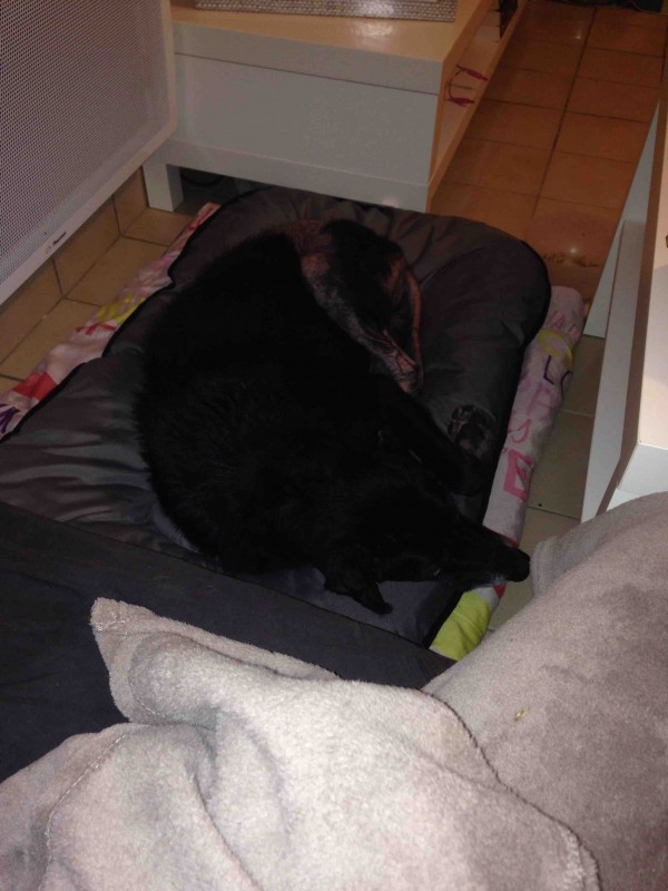 Aujourd'hui on lui a acheté un panier à lui, il est donc installé devant le radiateur du salon, auprès du canapé, il profite de l'animation.