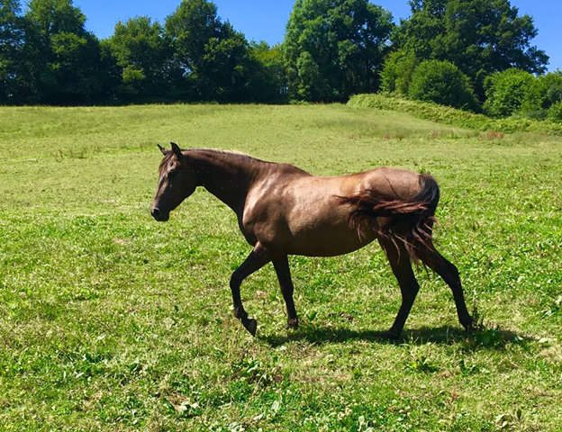 Une de ses juments, qui prendra 4 ans au printemps, robe smocky black, qui toisera probablement dans les 1m62... A 5300 non débourrée ou 5800 débourrage compris...