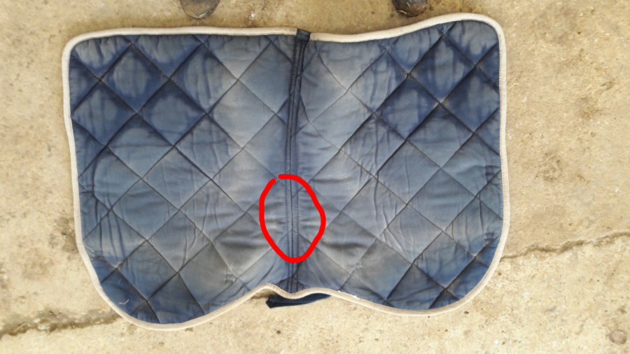 Ici, il me semble...qu'il y a un peu de saleté au milieu (dans la zone que j'ai entourée de rouge), donc est ce le tapis qui s'écrase, qui degarotte mal ou la selle qui touche, c'est une piste a contrôler si le changement de sangle n'a pas adouci le comportement de ton cheval.