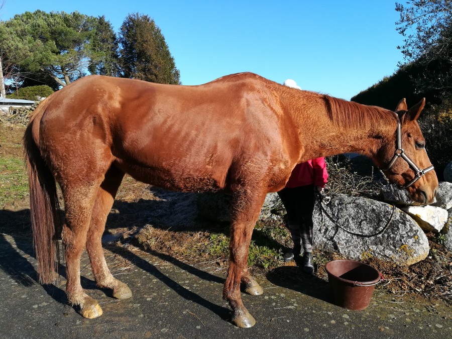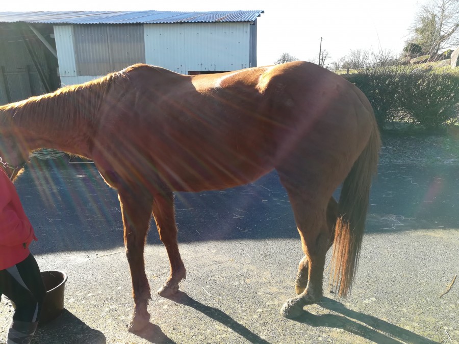 Parallèlement à cela, ma chouchoute de club, Solanga pur sang anglais de son état et 11 ans au compteur, s'abîme les tendons postérieurs, descente de boulets et tout le toutim. Et ce, de manière définitive. Elle n'est plus montable. Nous sommes alors à la mi-juillet. Elle perd avec cela énormément de poids très rapidement, devient cadavérique à cause notamment de la douleur elle ne mange plus et ne veut plus bouger évidemment.