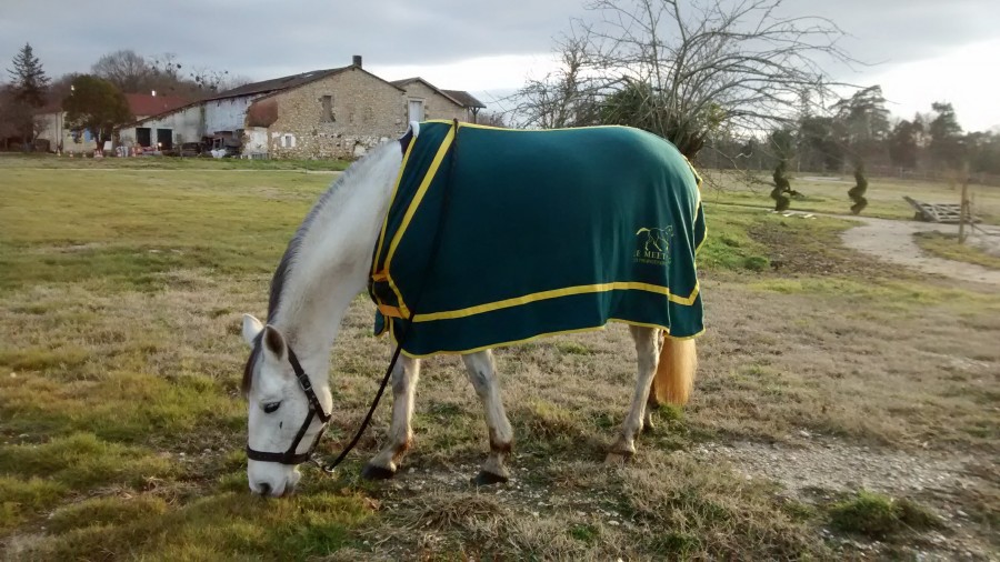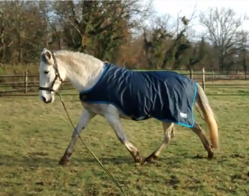 et environ 1 fois par semaine, je la laisse jouer au rond de longe, ou bien la longe un peu pour voir comment elle se déplace, et dans ce cas là elle mets la chemise de marcheur :