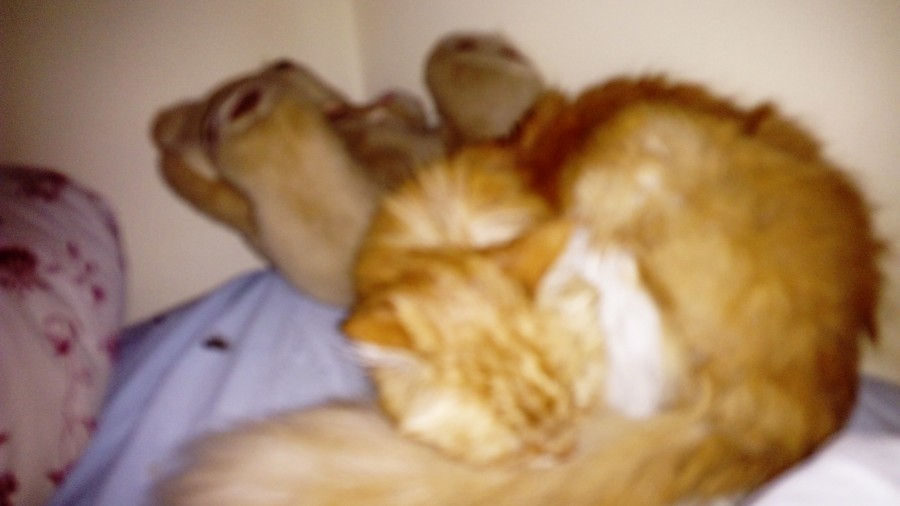 Mon doudou avec sa nouvelle "poupée' ce soir... Oui, ce que vous voyez est la patte arrière...
