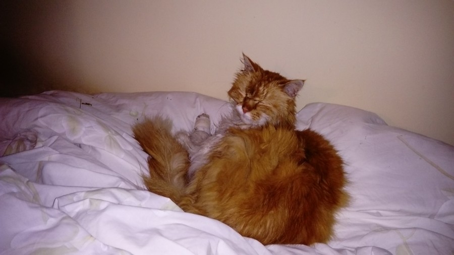 Il monte sur le lit et le canapé sans soucis. Il ronronne quand je gratte là ou sa patte folle ne peut plus gratter. Je lui ai remis ce soir une pipette pour les tiques et puces.