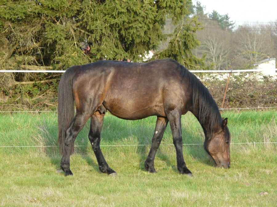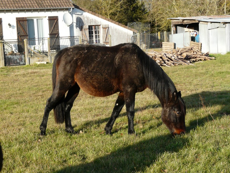 il est au foin a volonté de bonne qualité de octobre a avril. a l'herbe le reste de l'année.