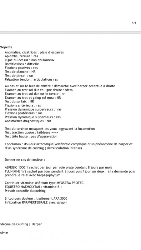 - janvier, pas d'amélioration, on test le Cushing, il est positif. De plus dès qu'il pleut il devient sensible, marche en relevant fort les postérieurs dès que le sol est humide...L'ostéo passe :