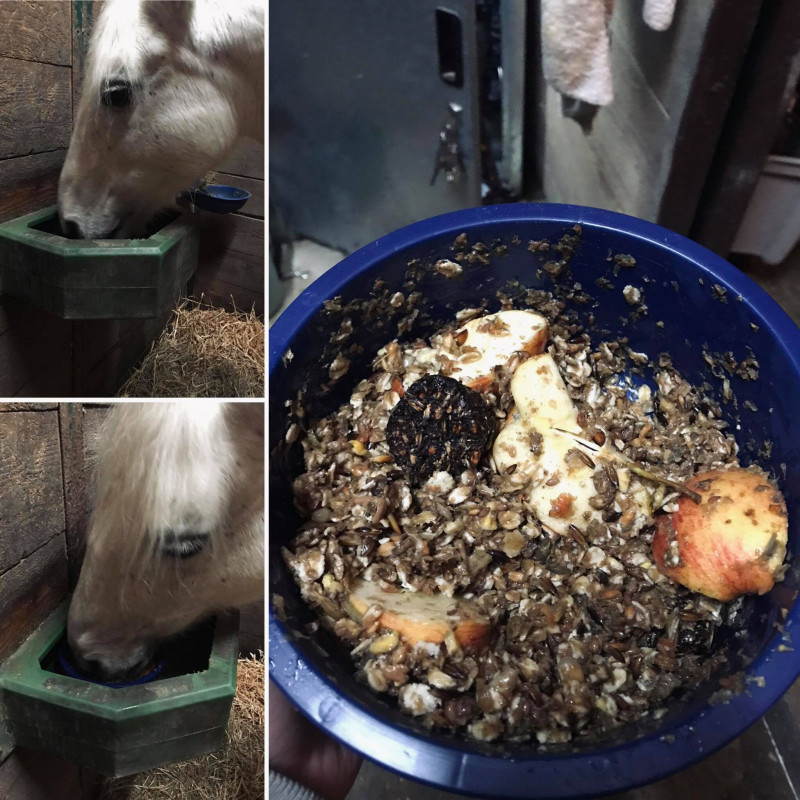 Après une semaine à veiller mon cheval tous les soirs jusqu'à 22h avec 3 doudounes au fond du box, elle c'est améliorer un petit peu chaque jour. Nous avions commencé la deuxième étape qui était de tenter de la réalimenter avec tout et n'importe quoi du moment qu'elle mange.