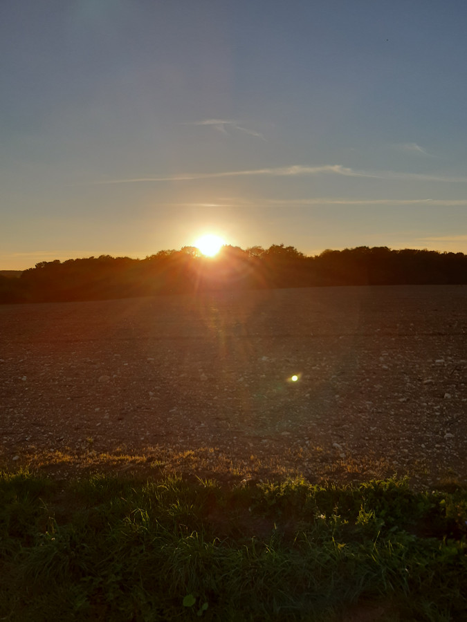 À la fin il avait bien bossé mais pas de transpiration quand même. On a profité du coucher du soleil, mais on ne voyait pas grand chose c'était très nuageux. On est rentrés lorsque l'étoile du berger venait de s'allumer. Sunny chéri
