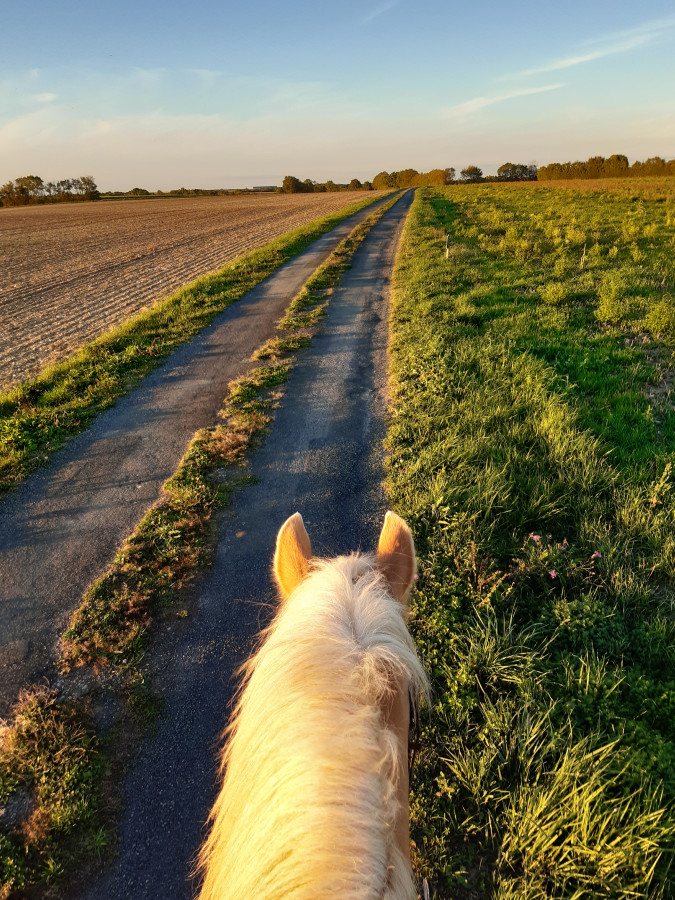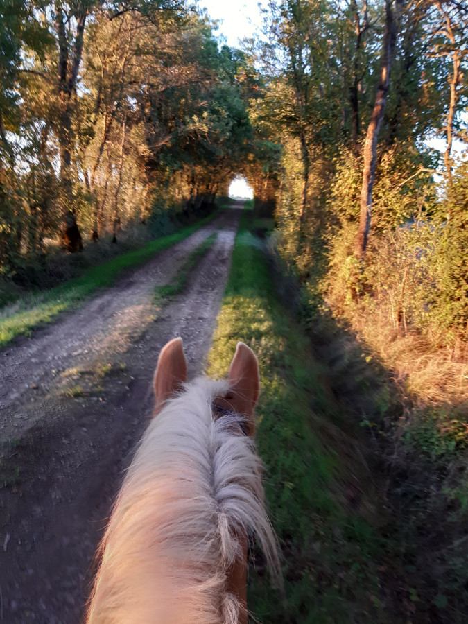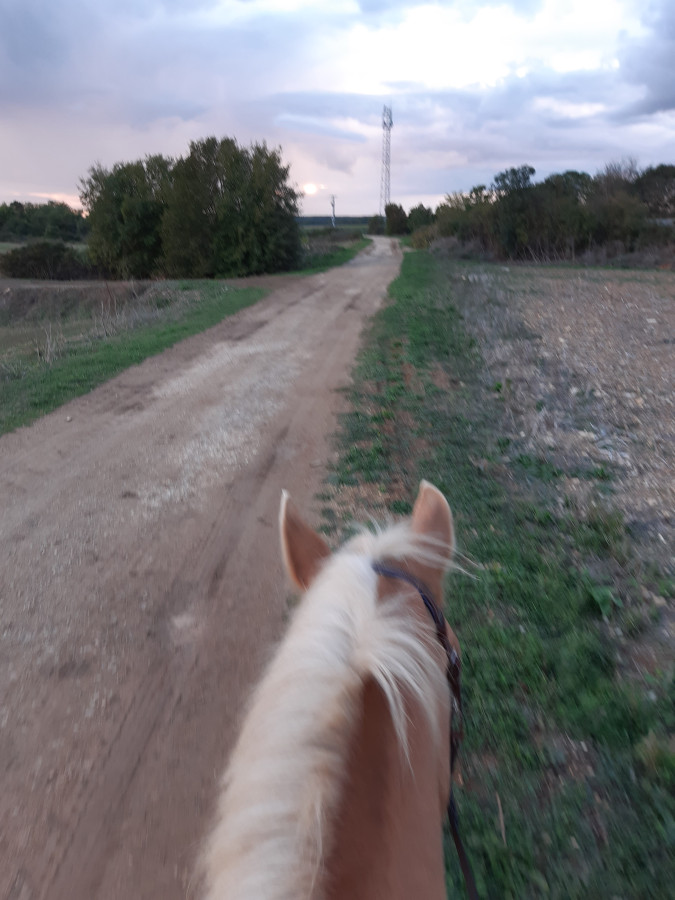 Hier soir balade avec Sunny, après une journée très difficile au boulot. J'ai mis du temps à décoller les problèmes de taf de ma tête aux écuries, j'étais encore en plein dedans pendant le pansage mais Sunny a été hyper patient, le temps que je revienne dans mon corps, il ne m'a pas bousculée ou quoi comme il l'aurait fait il y a quelques années... il est si tolérant avec moi
