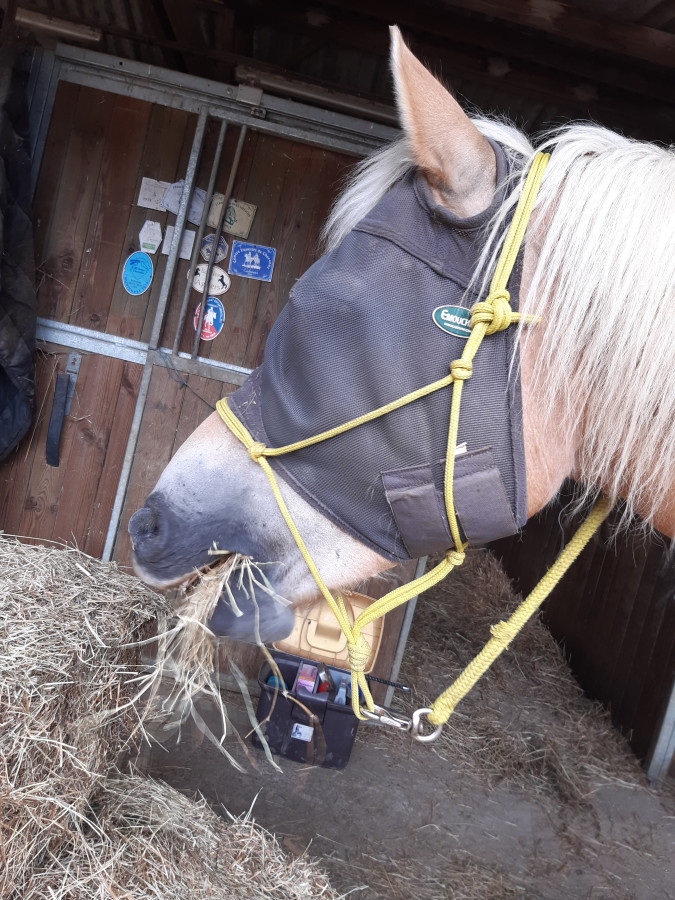 Du coup avec le nouveau masque l'oeil de Sunny est beaucoup plus ouvert! Par contre je le trouve un peu plaqué sur les côtés ce masque, la gérante de l'écurie le trouve ok mais j'ai un doute quand même... ça comprime un peu les rochers et notamment celui qui est un peu gonflé.