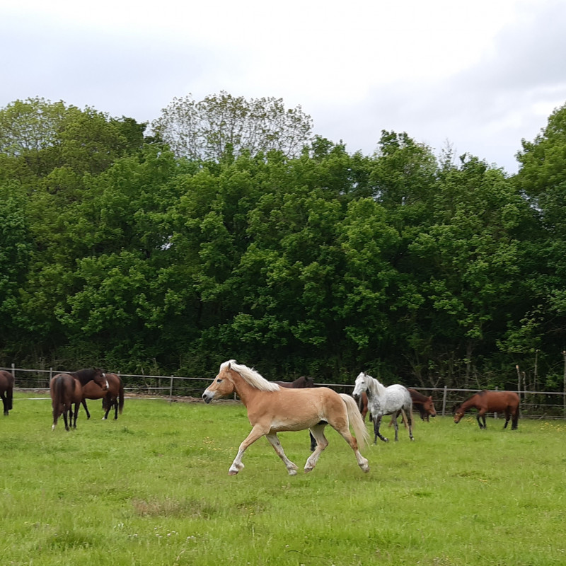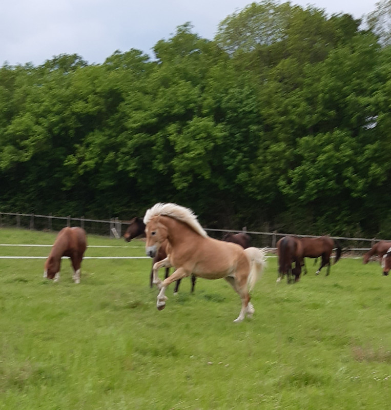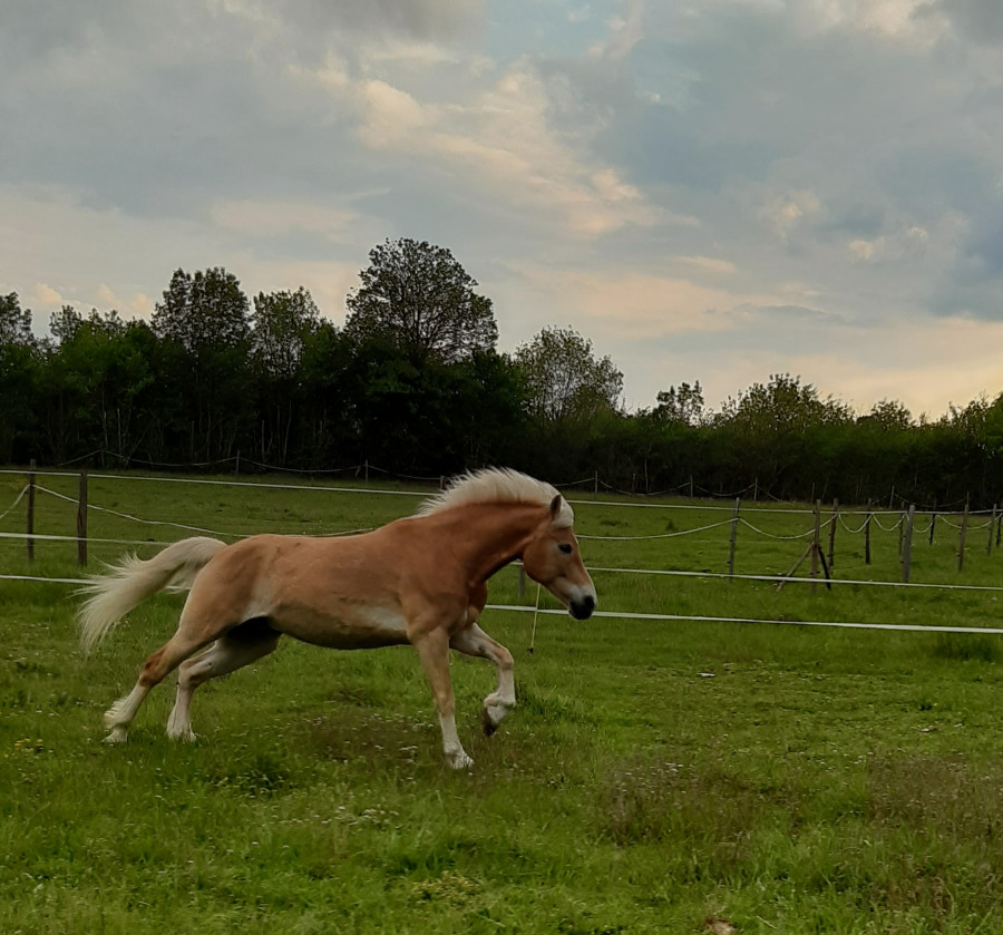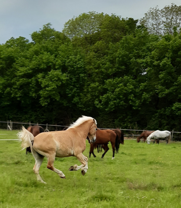 Et puis est venu le grand galop. Oui, graaand... La jument de tête l'a carrément semé hahah, il était à fond mais ne suivait pas quand même sur le chemin en herbe ! Il a fini par s'emmêler les antérieurs avec les chaussures, je l'ai redressé sinon il tombait sur les genoux xD Et puis il s'est calé sur un galop moyen, la jument ralentissait aussi un peu, et là... Elle a eu peur d'un canard sur le canal qui bordait le chemin, elle a pilé sur les postérieurs, Sunny a pilé et a failli tomber sur les genoux !