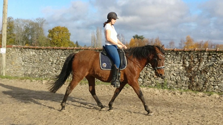 Au pas rênes longues, s'arrêter grâce à l'intention et l'énergie + chercher à obtenir le report de poids vers l'arrière dans cette même optique puis repartir au pas.