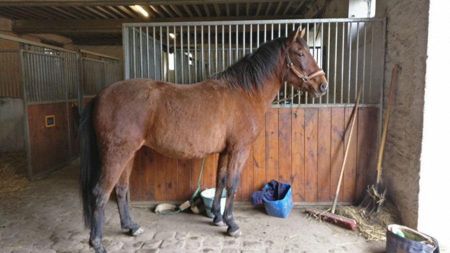 Puis je mets le tapis (toujours réaction au sanglage mais nettement moins violente qu'avec la selle), elle ne bouge pas au montoir et je commence à la marcher rênes longues au pas : RAS pas de respiration forte, ouf !