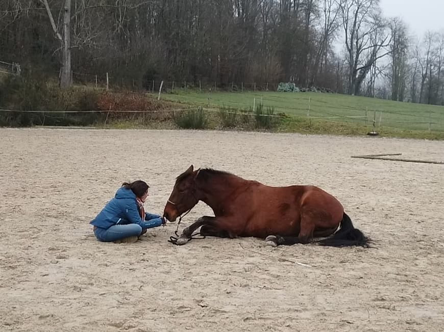 On annule le cours, je descends, je retire la selle et je lui propose de se rouler : une fois relevée plus rien au niveau du souffle. Je remets la selle pour voir : de nouveau un souffle rapide et hyper fort ! Ok Calina j'ai compris le message, on met la selle au placard en attendant le retour du SF...