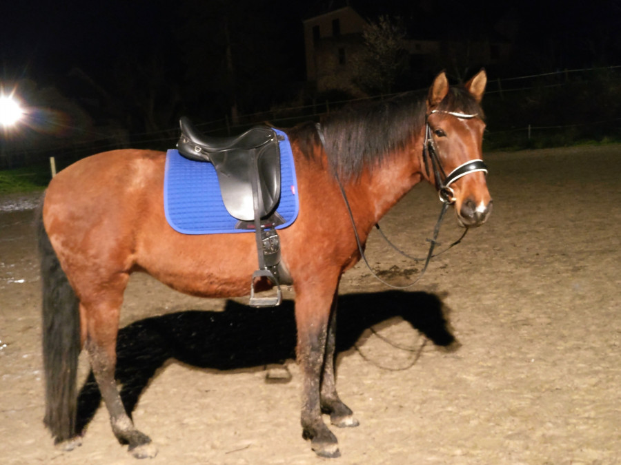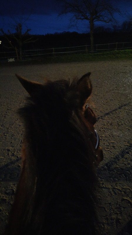 mini séance en carrière : Quelques minutes d'instant présent une fois à cheval et on part sur la piste au pas rênes longue, elle est ultra zen malgré le vent et la nuit, en ce moment elle m'épate vraiment là-dessus !!