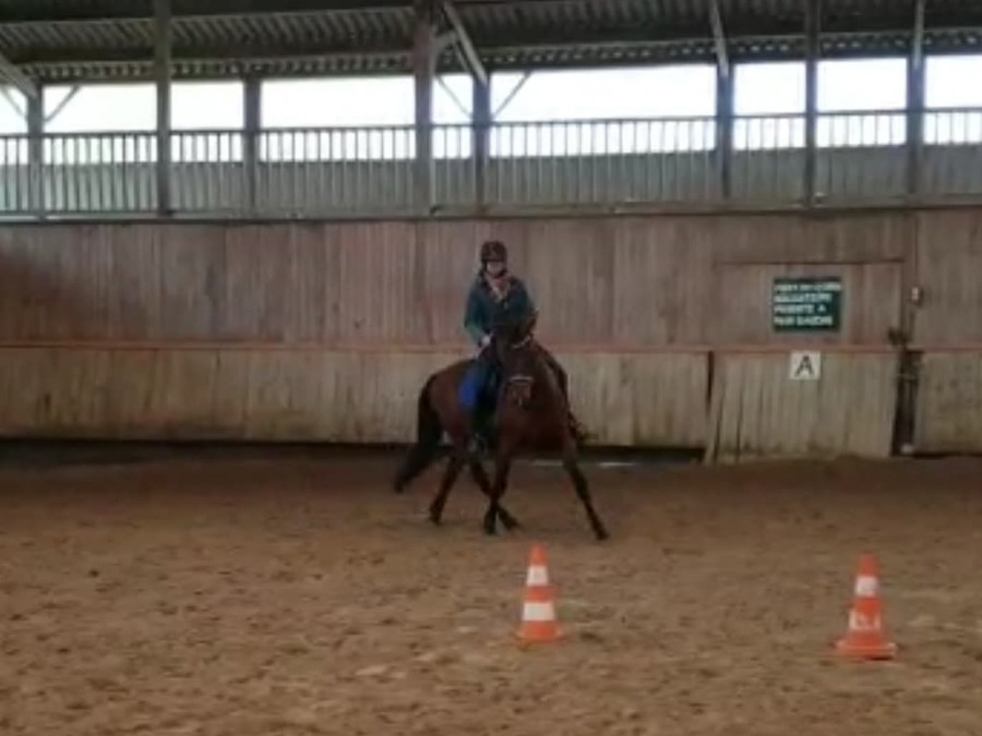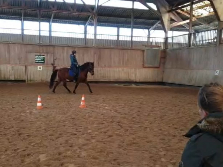 Mon amie se met en selle et commence son cours, beaucoup de travail sur l'incurvation pour aller chercher l'engagement du postérieur interne, correction de la posture des jambes, travail sur la réactivité du cheval.