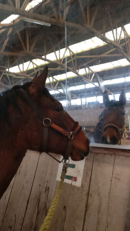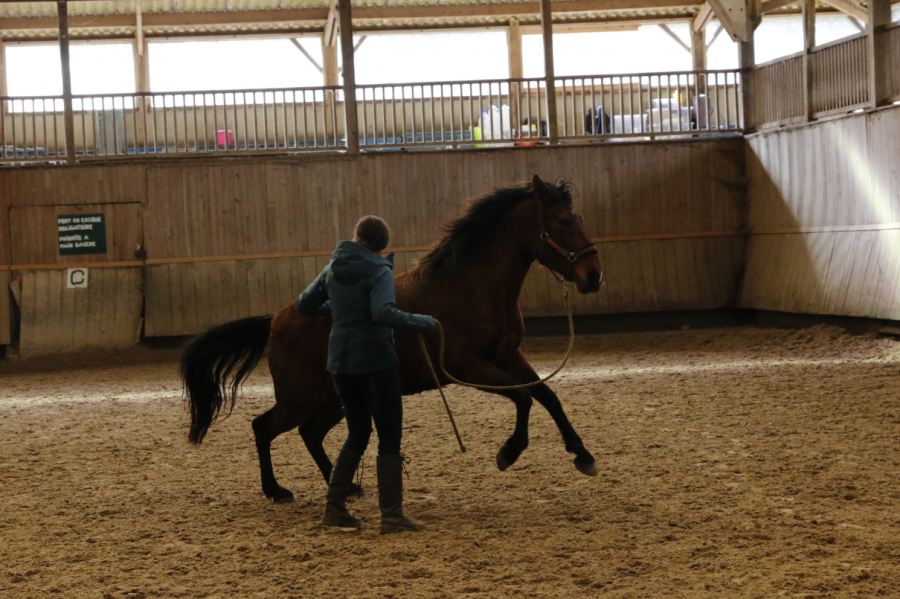 Bizarre alors je lui propose de trotter / galoper un peu : elle jette son jus avec coup de cul et compagnie, je pense qu'elle avait besoin d'évacuer le stress du transport (je me fais ensuite engueuler parce qu'il ne faut pas longer dans le manège, OUPS) une fois calmée, RAS pour la seller et la brider, ouf !