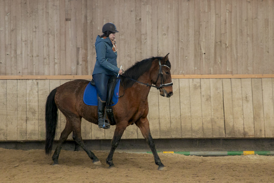 Je commence au pas rênes longues avec de grandes courbes uniquement demandées au poids du corps et ça passe sans souci. Je reprends un peu mes rênes pour la mobiliser un peu plus et rechercher l'engagement du postérieur interne en