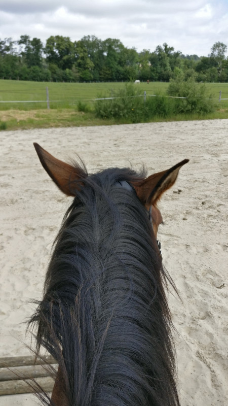 Du coup j'ai pris plus de rênes et j'ai demandé des 8 de chiffres en recherchant le fait qu'elle se pose et en me concentrant sur moi-même pour ne pas m'agacer, exercice difficile mais je finis par obtenir de la concentration et de la décontraction, au point que je trotte même quelques foulées à chaque main.