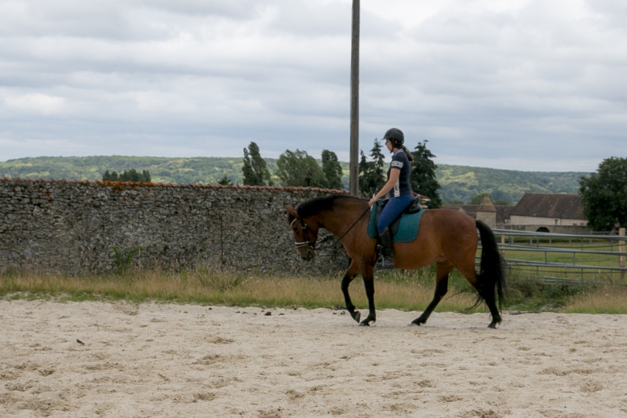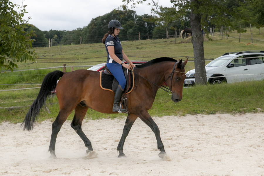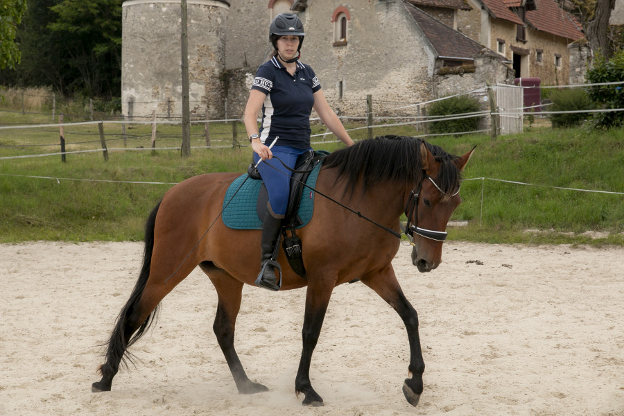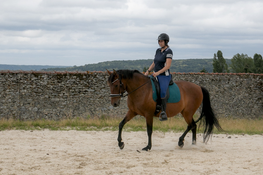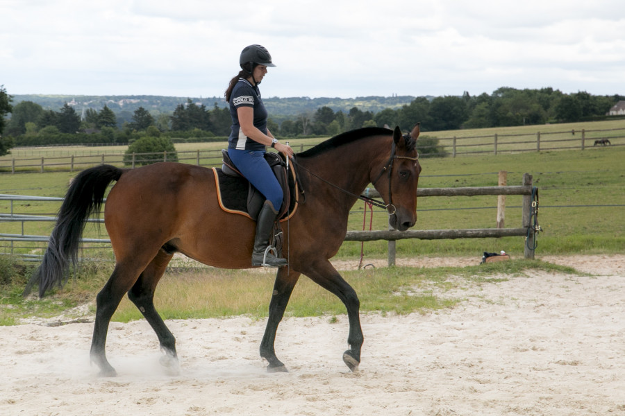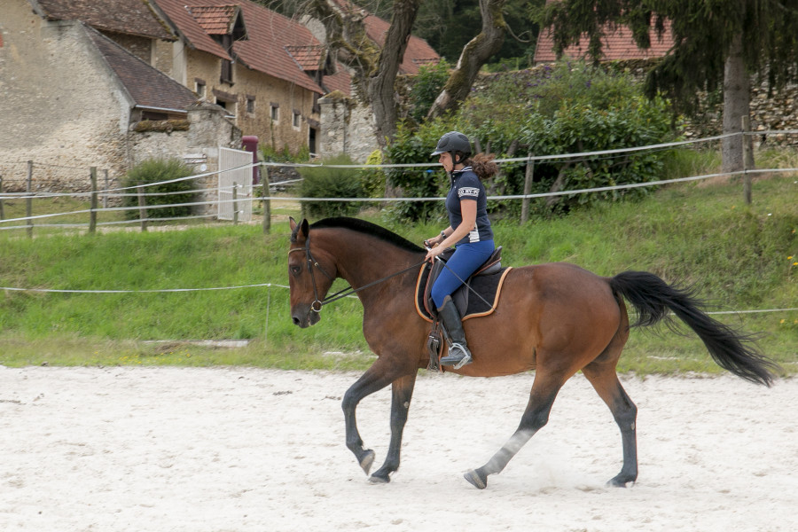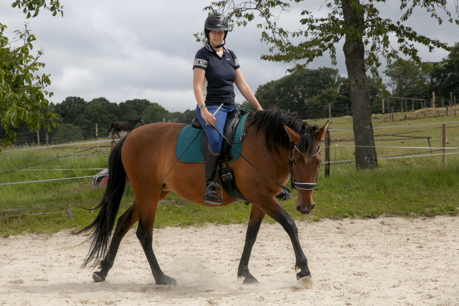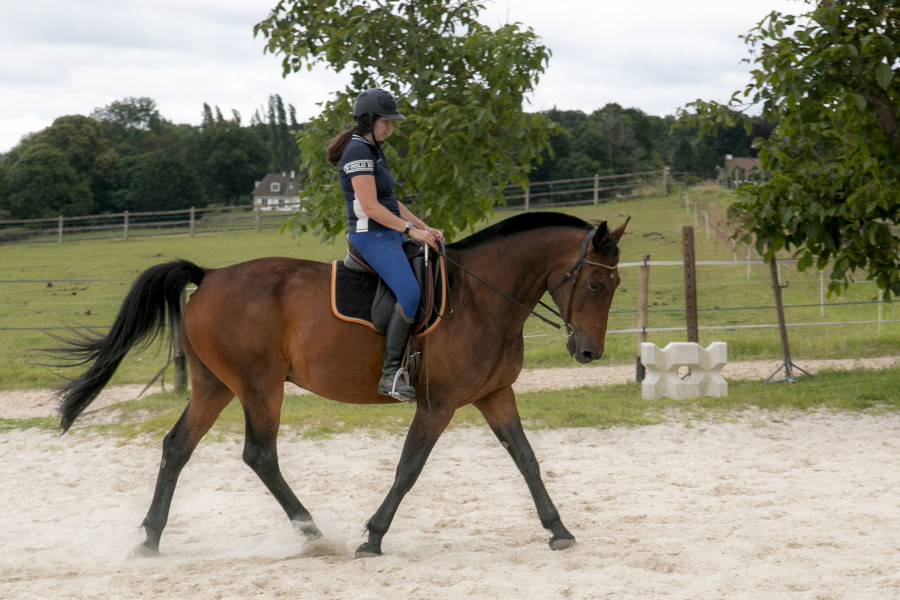 Des départs au trot uniquement à l'assiette / l'énergie (idem pour les transitions descendantes vers le pas et l'arrêt) et sans qu'elle ne se relève ni qu'elle ne creuse son dos puis dans le trot variation de l'attitude devant en alternant extension (mais elle s'enferme car manque de tonicité du dos) et plus relevée.