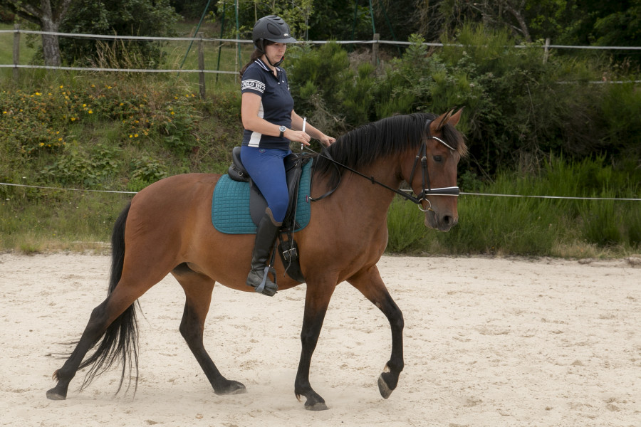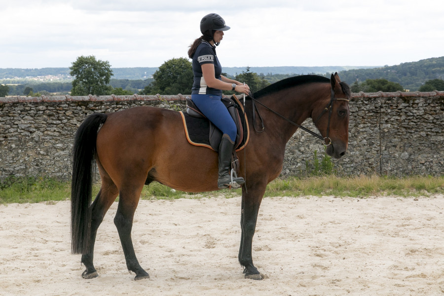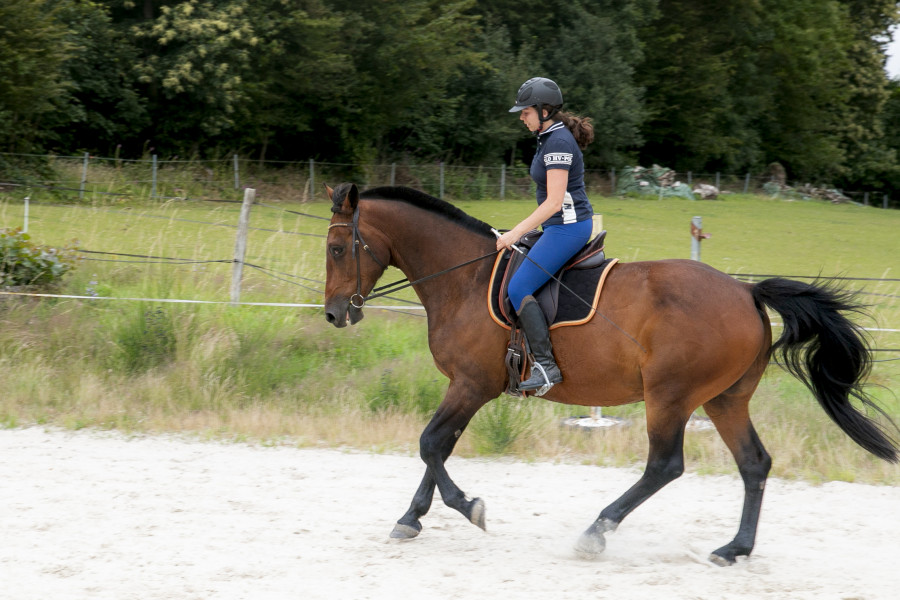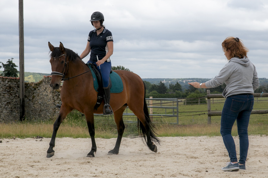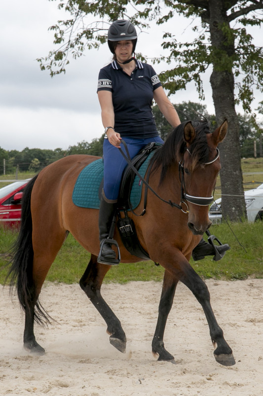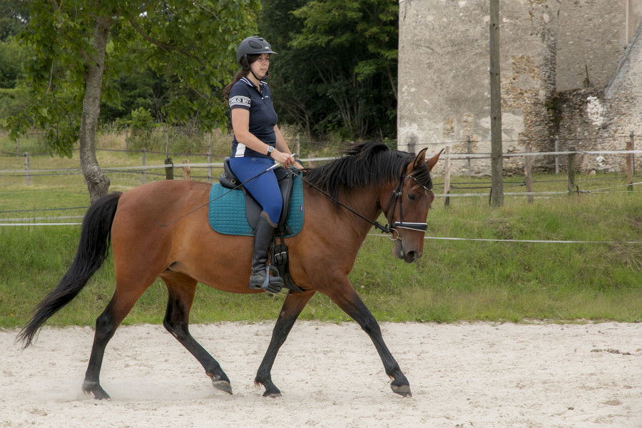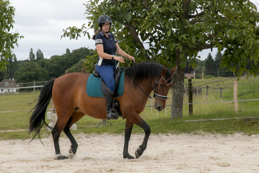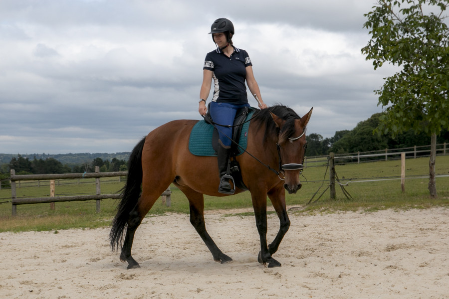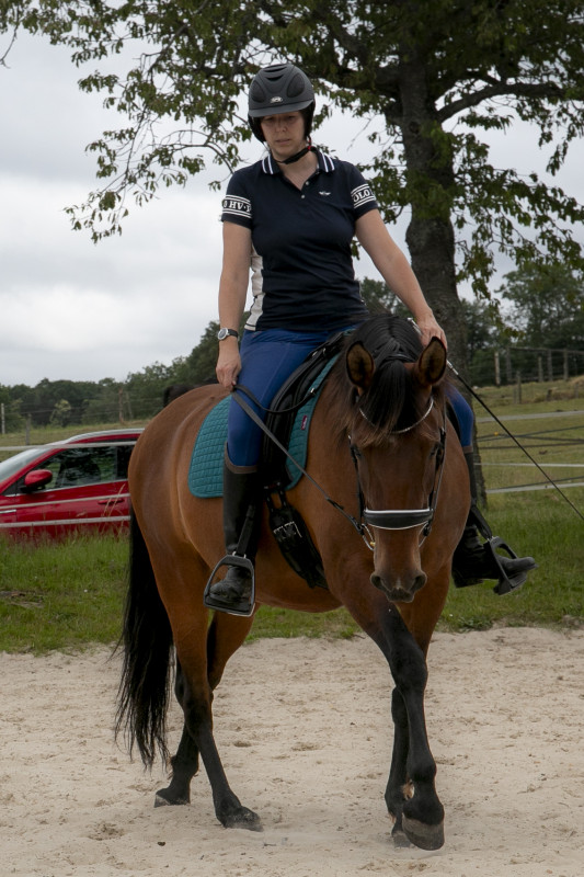 Des départs au trot uniquement à l'assiette / l'énergie (idem pour les transitions descendantes vers le pas et l'arrêt) et sans qu'elle ne se relève ni qu'elle ne creuse son dos puis dans le trot variation de l'attitude devant en alternant extension (mais elle s'enferme car manque de tonicité du dos) et plus relevée.