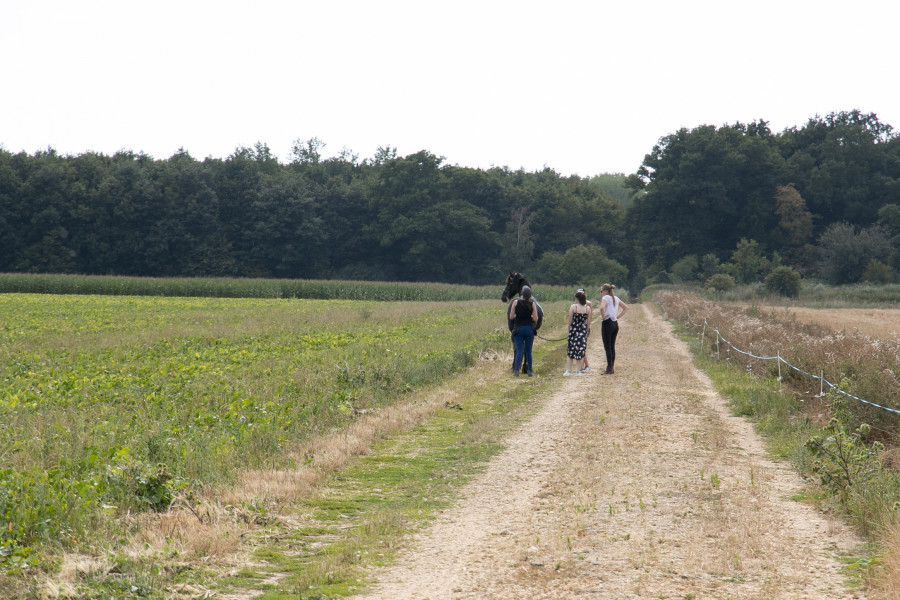 On commence la séance, le but étant de sentir comment elle marche après la séance de shiatsu de mardi et si elle est droite au pas : départ un peu hésitant et on sent que la variation du sol ne l'aide pas...