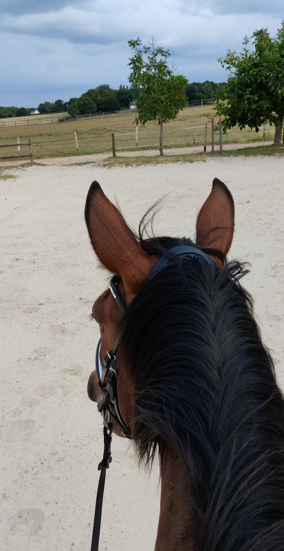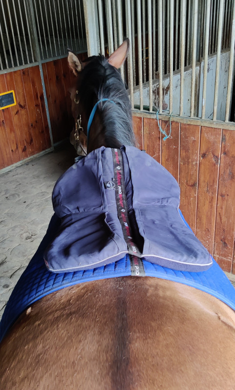 Test de l'amortisseur en carrière et sans aucune cale pour voir ce que ça donne (lors des 2 dernières balades avec les cales la selle tournait : le problème des chevaux ronds lorsque la couche sous la selle est trop épaisse) vu qu'il est à mémoire de forme je trouve que la selle tombe plutôt bien alors j'ai bon espoir !