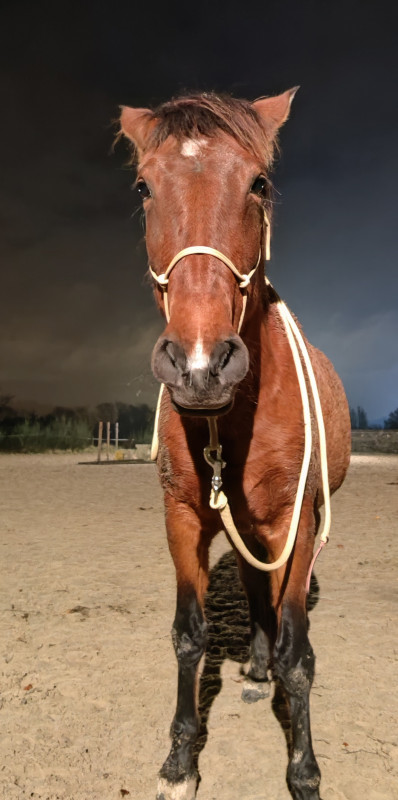 Elle panique, cherche à partir sur un côté, se rassemble pour reculer les antérieurs sans bouger les postérieurs, manque de m'écraser quand je la remets droite... Je ne m'y attendais pas !!