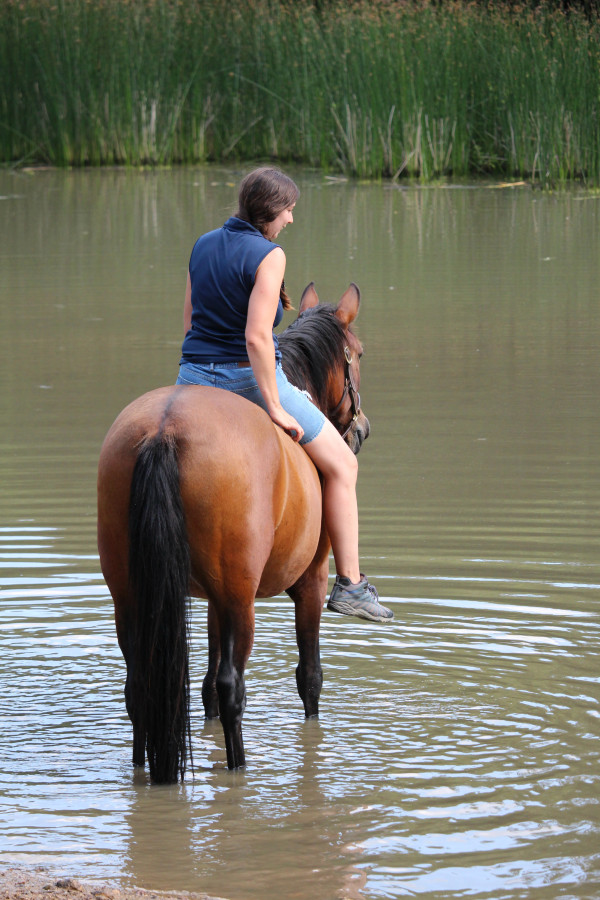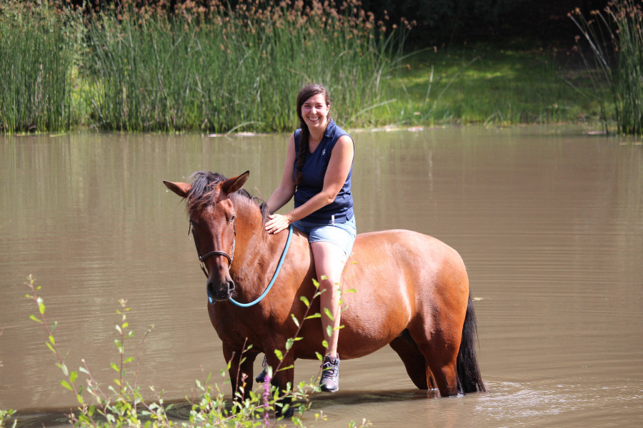 Calina avait envie d'aller dans l'eau et je la sentais frustrée d'être limité par la longe du licol alors hop, à cheval pour aller dans l'étang avec elle, à cru et en licol. Elle a bien joué dans l'eau