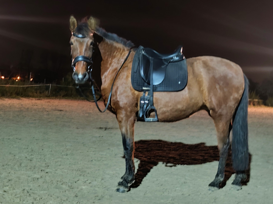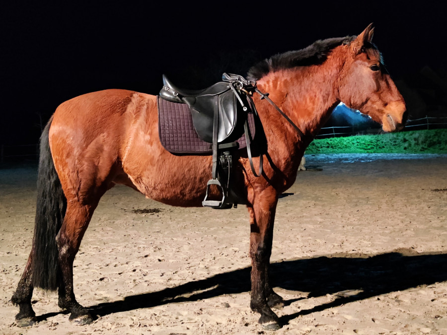 Beaucoup de pas rênes longues en cherchant l'activité et la décontraction en essayant d'être focus sur mes propres déséquilibres droite / gauche et en incluant des changements de main / des arrêts et des reculer.