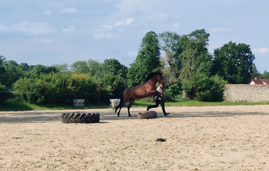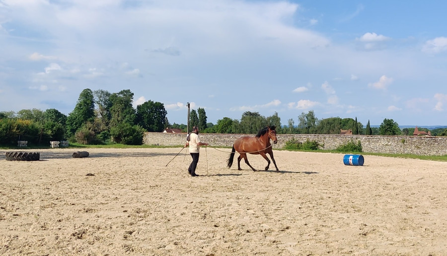 A cheval faire la piste au pas + au galop rênes longues avec quelques tensions cause tas de branchages sur les bords de la carrière
