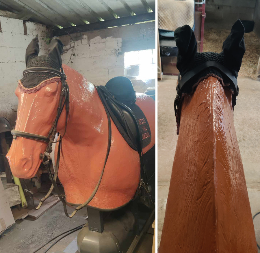 On prend le temps de bien placer ma selle sur le dos du simulateur (affectueusement baptisé Val d'Or) pour être au plus près de mes ressentis habituels. On commence avec jambes par dessus les quartiers et mains posées sur l'encolure, proches des oreilles pour bien étirer mon dos et dans le même temps échauffement du corps grâce au balancier régulier de Val d'Or.