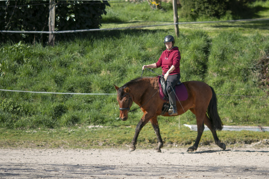 Cercle au pas et à la porte départ au trot > cercle au trot et à la porte départ au galop > cercle au galop et à la porte retour au trot > cercle au trot et à la porte retour au pas > cercle au pas et arrêt à la porte.
