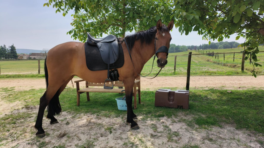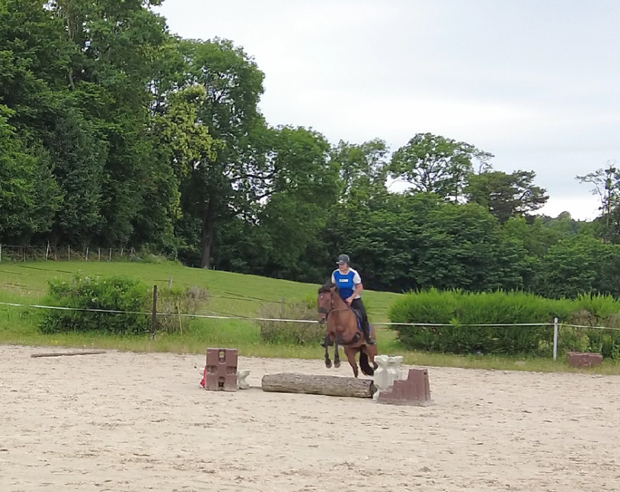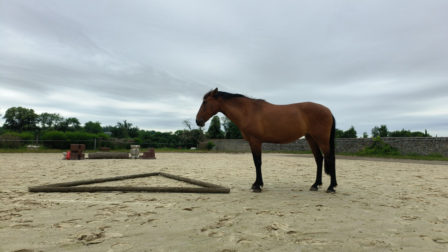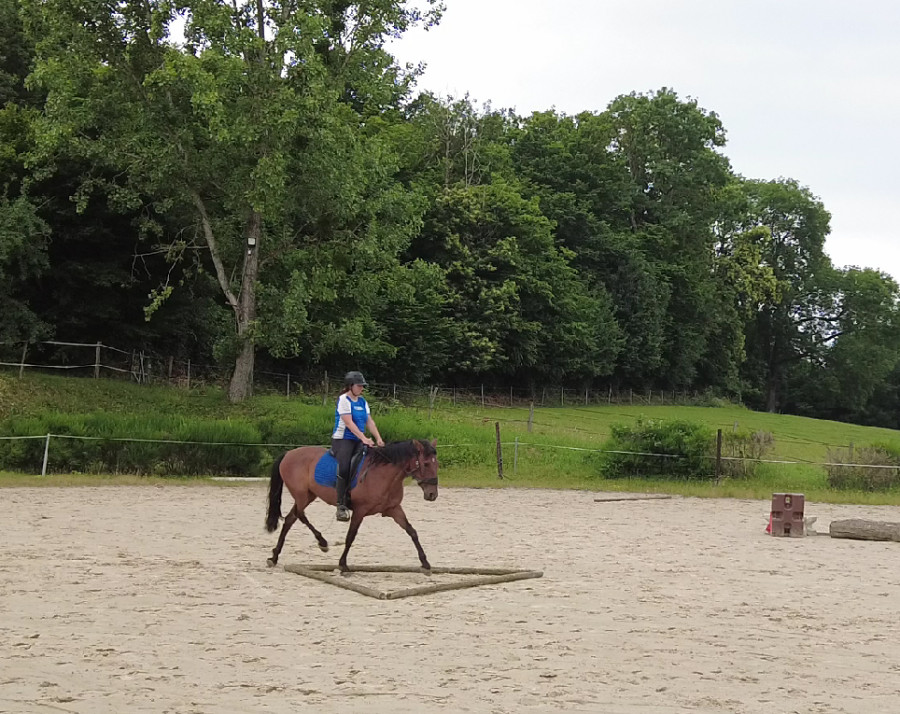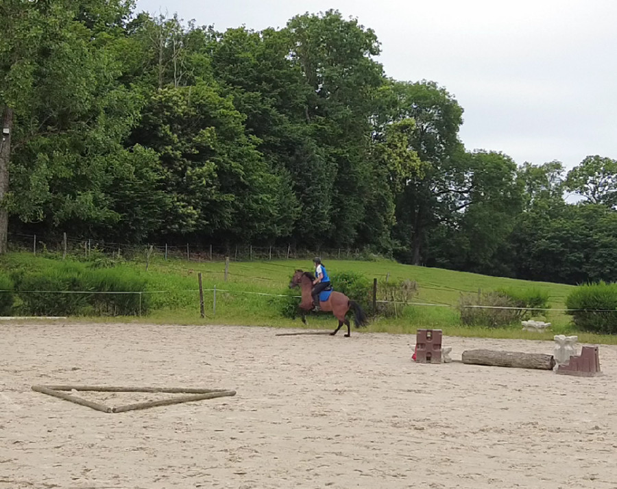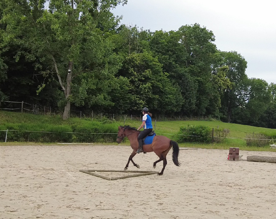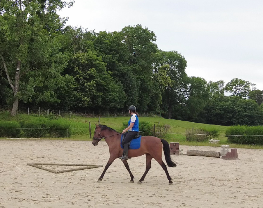 Révisions du cours de mardi : dispositif de BAS en triangle à passer aux 3 allures en osant la laisser avancer plus dans le trot et le galop quitte à avoir un peu de déséquilibre pour le moment et régler ça dans un second temps. Nickel ! Au pas et au trot on peut sans souci enchaîner les boucles. Au galop elle fait ça super bien et m'offre même des changements de pied droite>gauche !