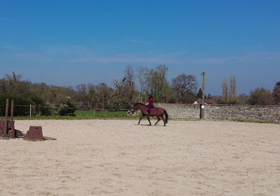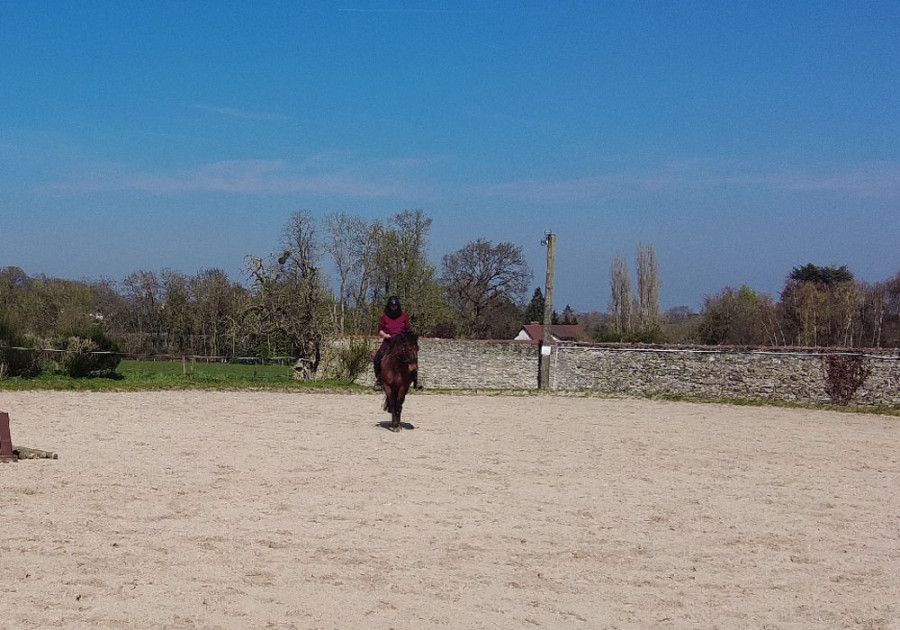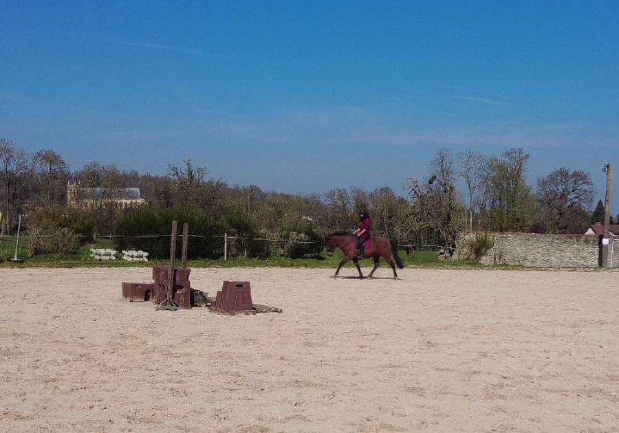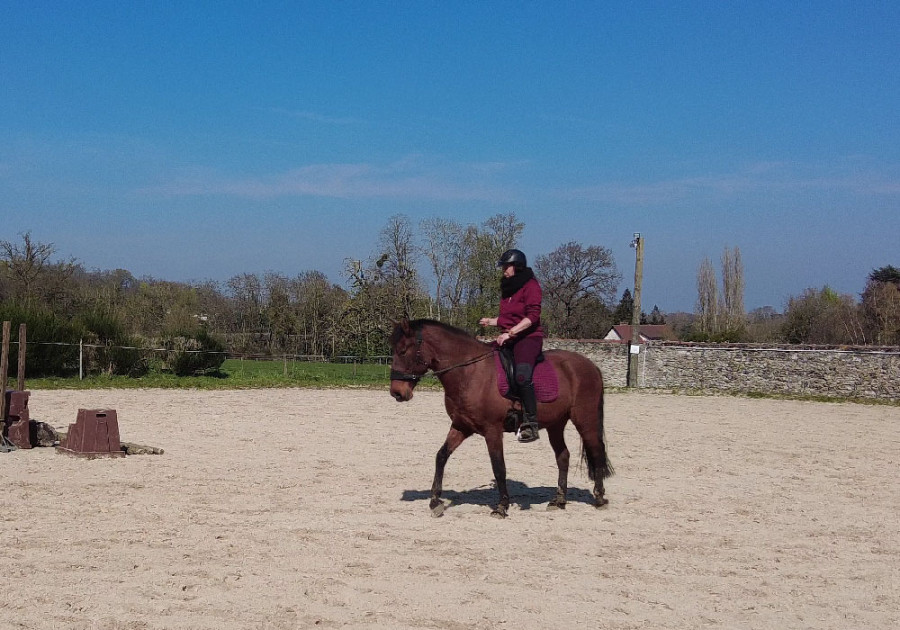 Beaucoup de mobilisation au pas : cercles, demi-volte, spirale, EED, HED et quelques foulées d'appuyer. Puis boulot sur les transitions et les allures en cherchant le dos/garrot qui s'engagent